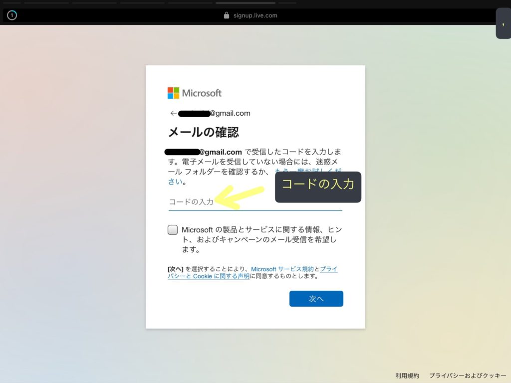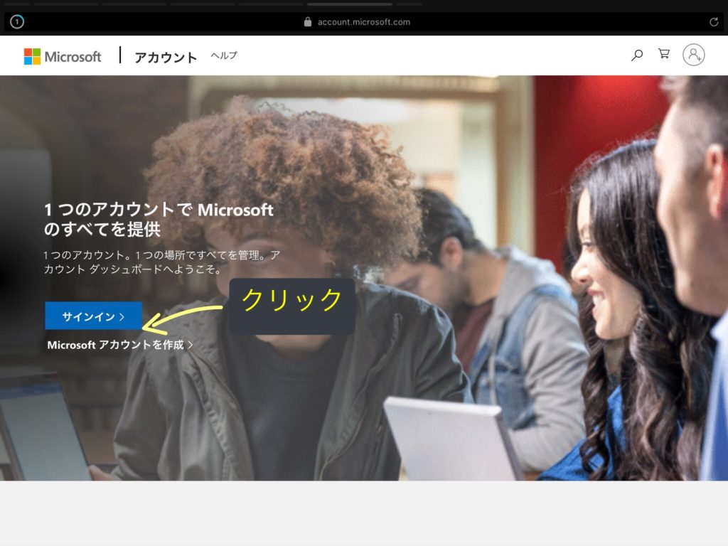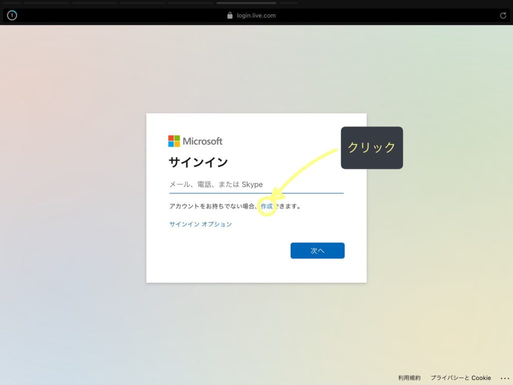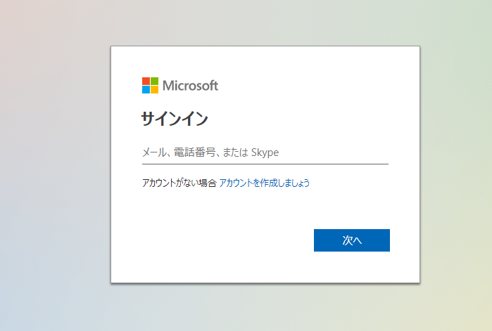 ①マイクロソフトアカウントのメールアドレスとパスワードでログイン