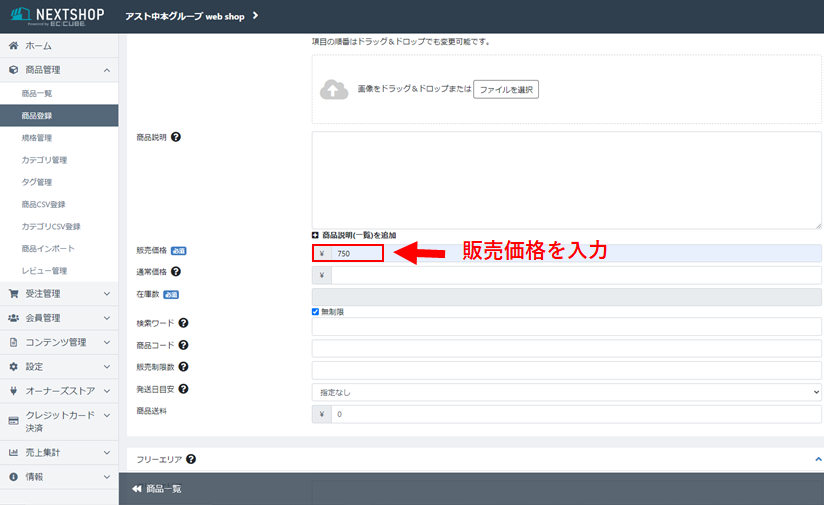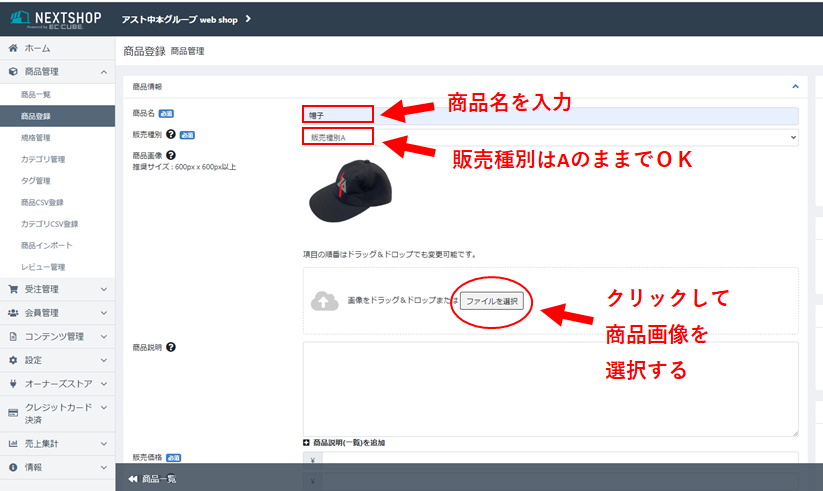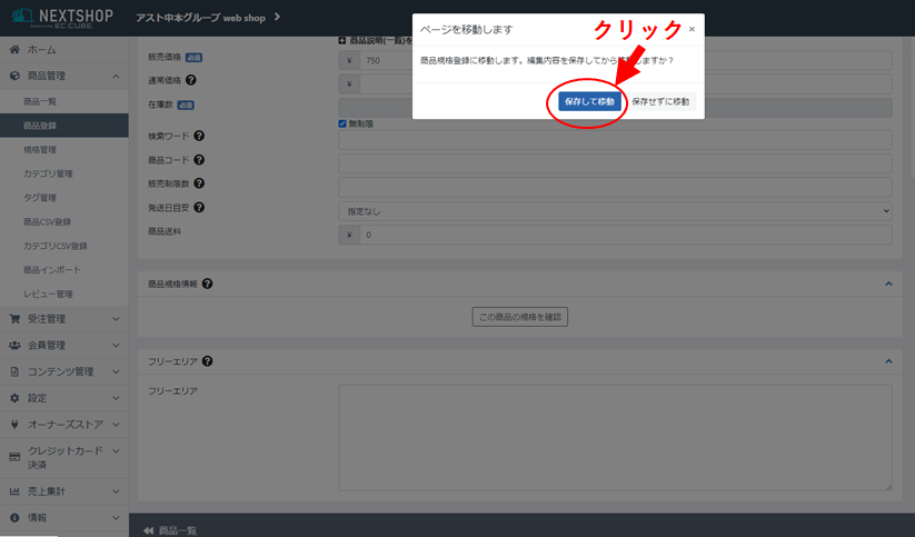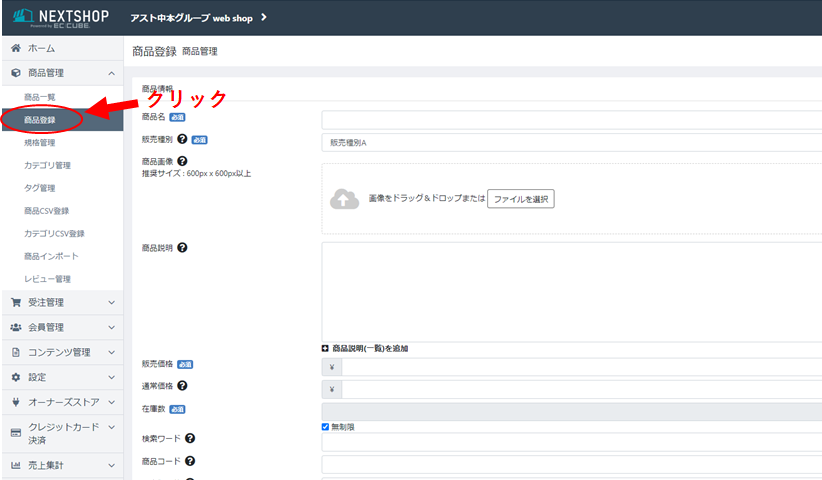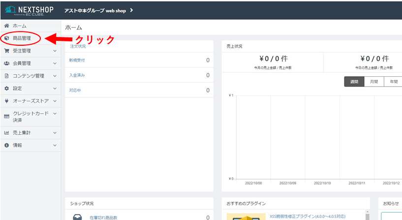 ①アスト中本グループweb shopの管理画面にログインし、商品管理をクリックする