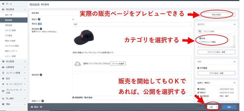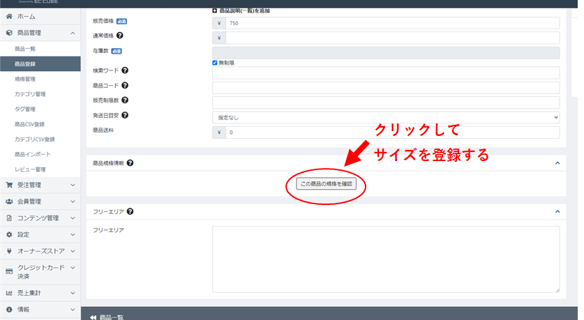 ⑥再度、商品登録の画面に戻り、この商品の規格を確認をクリックする