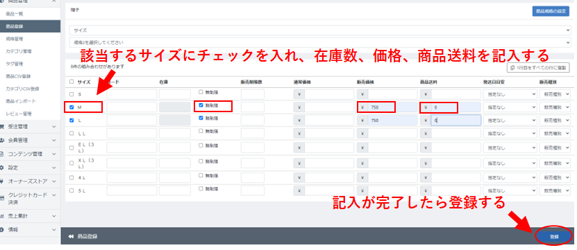 ⑨商品の該当するサイズにチェックを入れ、在庫数、価格、商品送料を記入する