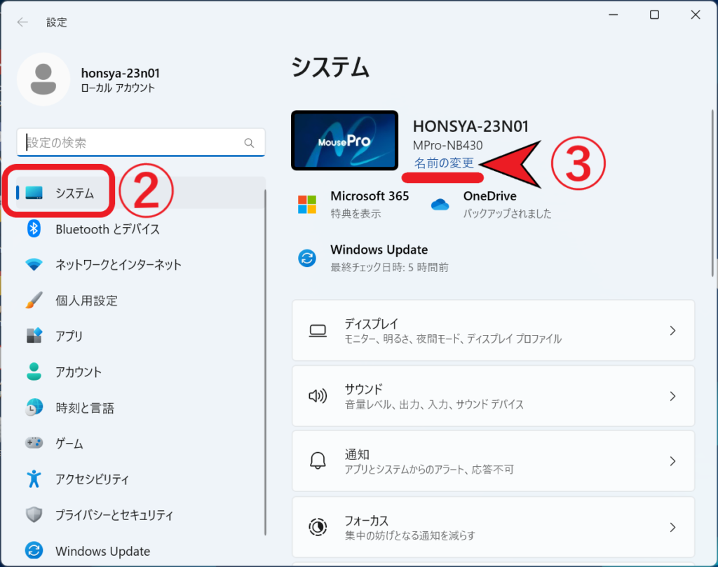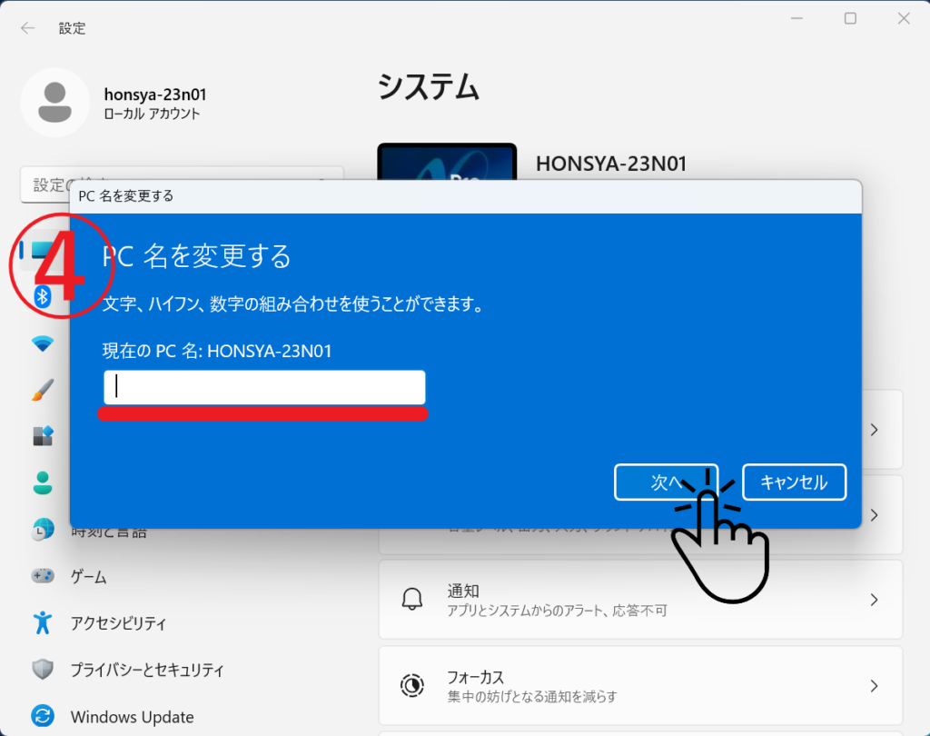 ④[PC名を変更する]ダイアログが開いてから、新しいPCの名前を入力して、[次へ]ボタンをクリックする。