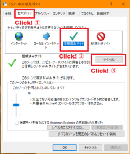 ④「セキュリティ」タブの「信頼済みサイト」を選択し「サイト」を開く。