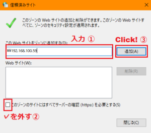 ⑤共有しているNASのアドレスを入力し、下部のチェックボックスのチェックを外し、「追加」をクリックする。